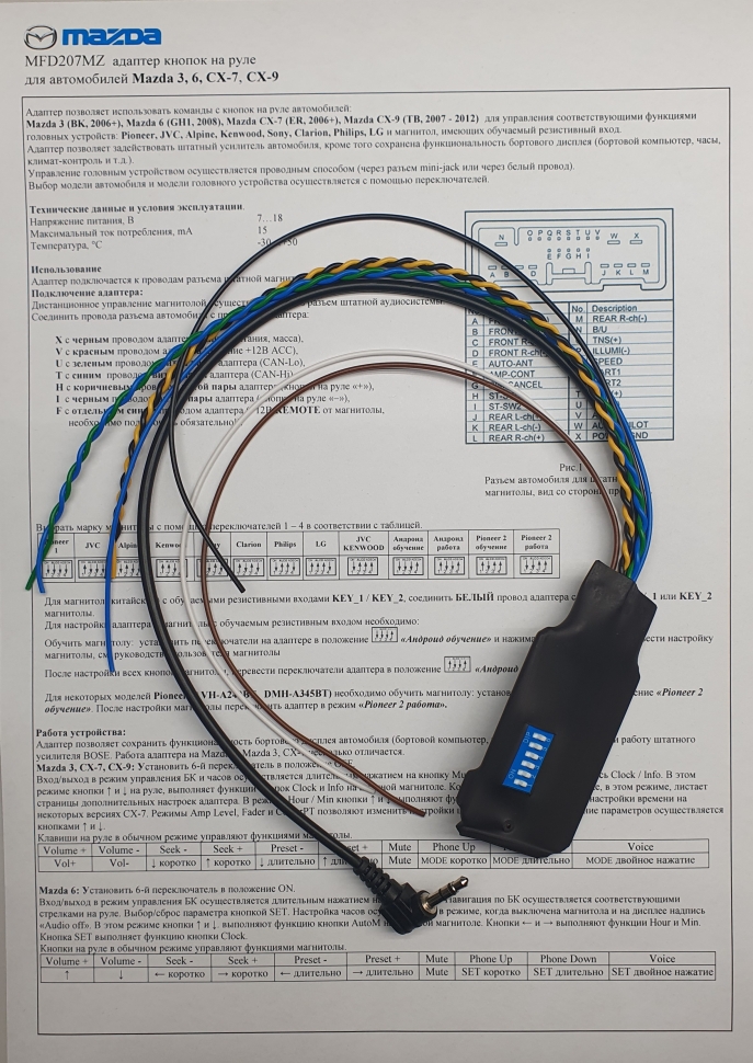 CAN адаптер MFD207MZ позволяет согласовать кнопки на руле для автомобилей Mazda 3 (BK, 2006+), Mazda 6 (GH1, 2008), Mazda CX-7 (ER, 2006+), Mazda CX-9 (TB, 2006 - 2015) с магнитолами: Pioneer, JVC, Alpine, Kenwood, Sony, Clarion, Philips. Так-же адаптер работает с китайскими магнитолами у которых есть обучаемый вход для управления KEY. Выбор марки магнитолы осуществляется с помощью переключателей. Управление магнитолой осуществляется через разъем (провод) дистанционного управления. Адаптер подключается к разъему автомобиля. В комплекте имеются разъемы для автомобиля и магнитолы (MZ-ISO). Адаптер позволяет сохранить работоспособность бортового дисплея, компьютера и усилителя BOSE.