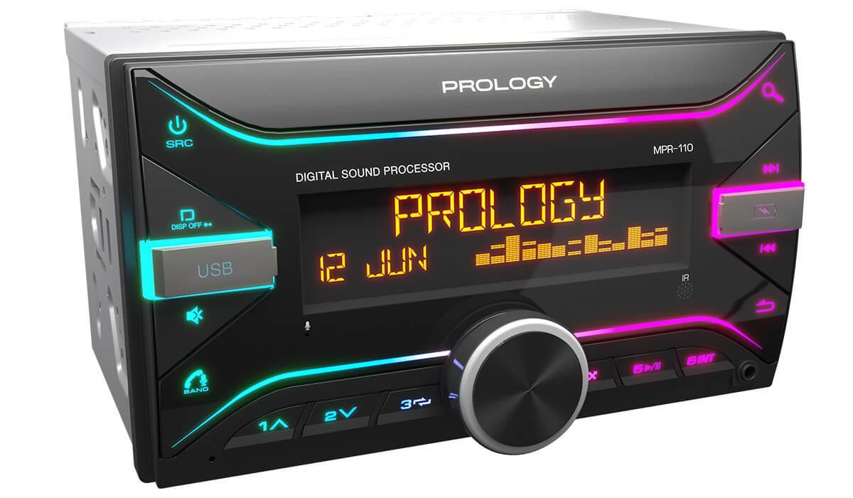 PROLOGY MPR-110 — FM / USB ресивер с Bluetooth и встроенным DSP-процессором стандартного размера 2DIN, который обеспечивает прием радиостанций в диапазонах FM / УКВ / AM и воспроизведение медиафайлов форматов MP3, WAV, и FLAC, записанных на USB-накопители. Устройство позволяет передавать звук с внешних источников через линейный аудиовход и беспроводной интерфейс Bluetooth. Поддерживается управление мобильным телефоном через интерфейс Bluetooth (ver. 5.3). Магнитолой можно управлять при помощи мобильного приложения Prology Audio, установленного на смартфон с операционной системой Android или iOS.