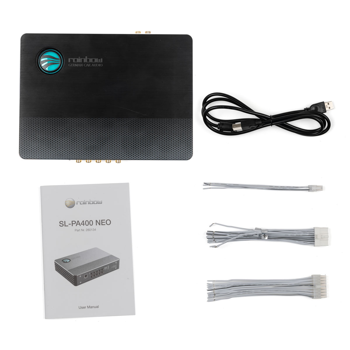 Аппарат имеет 10 независимых каналов предусилителя (RCA) для подключения внешних усилителей, 2 линейных (RCA) входа, 8 входов высокого уровня с автоматическим включением для подключения штатных систем, оптический вход Toslink, 8 каналов усиления на двух микросхемах Toshiba TCB503HQ. Сопротивление нагрузки (акустических систем) 2-4 Ом, что положительно сказывается на энергетическом запасе секции усилителя. На базе EL-PA400 NEO можно проектировать различные многополосные конфигурации аудиосистем. Будь это улучшение штатной системы, либо система уровня Hi-Fi с внешними усилителями мощности.