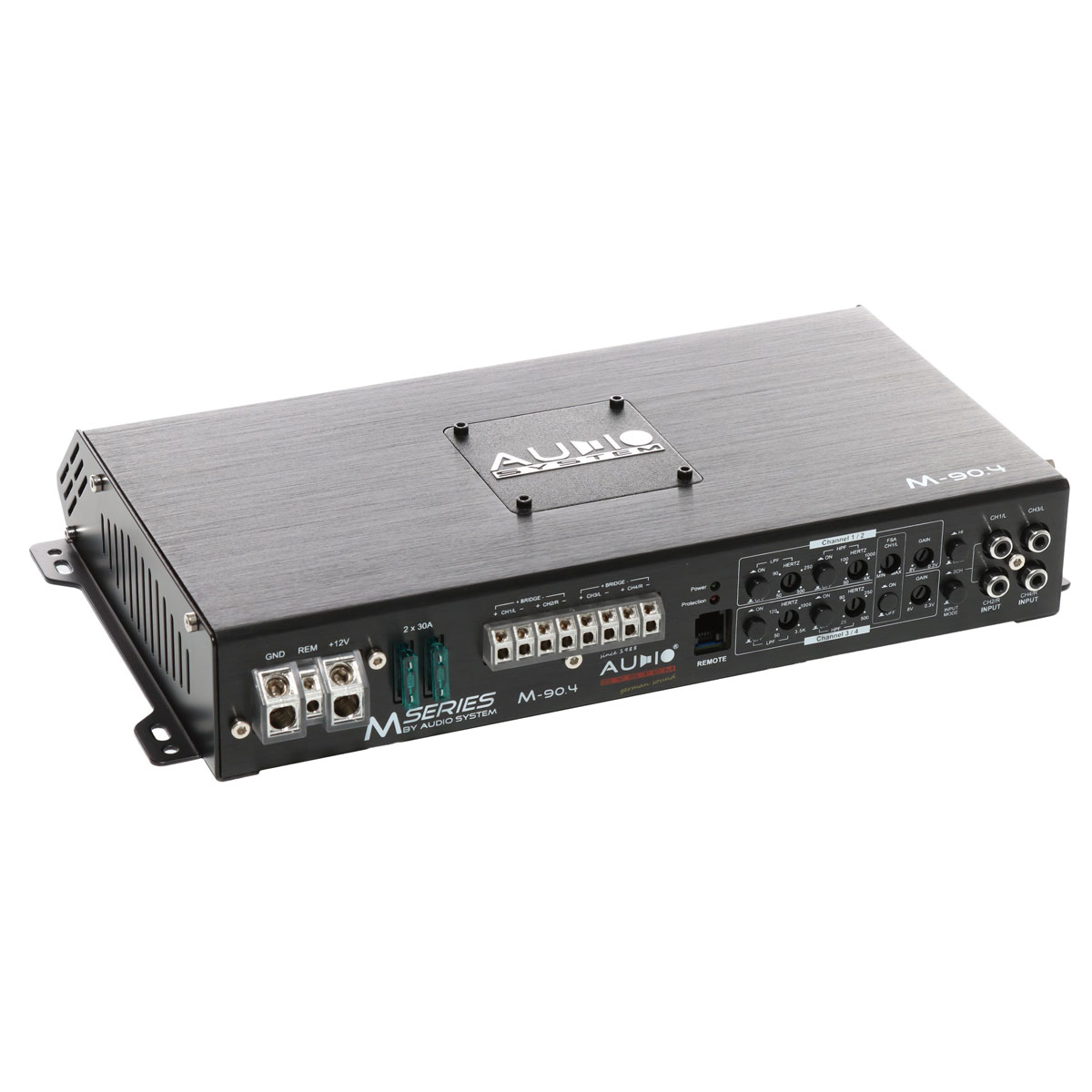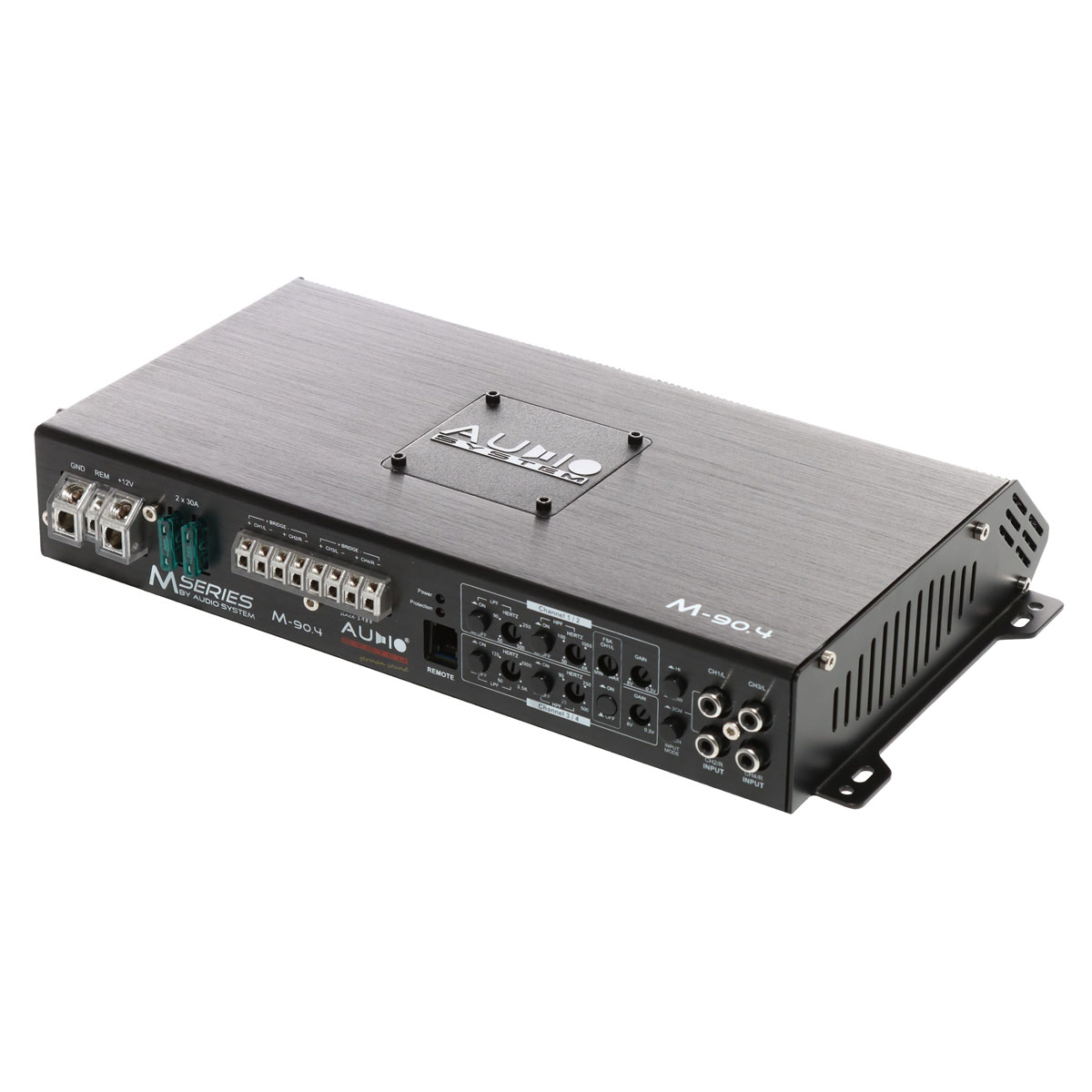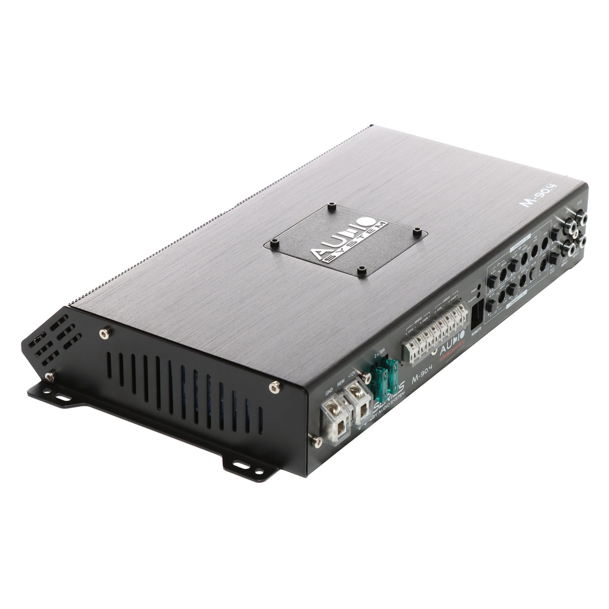 4-х канальный M-90.4 спроектирован для систем SQ. Компоновка органов коммутации и управления, находятся на одной стороне. Усилитель рассчитан на поканальное подключение фронтальных акустических систем. Например, твитеров и мидвуферов, благодаря развитой секции кроссоверных фильтров. В каждой паре каналов, помимо широких диапазонов ФНЧ/ФВЧ, можно организовать полосовой фильтр, для точной частотной настройки динамиков. Либо, работа на компонентный фронт + сабвуфер, мощностные характеристики располагают использовать подобную конфигурацию. Для такого случая, 3–4 сабвуферные каналы, рассчитаны на работу с проводным регулятором уровня сигнала RTC. При использовании усилителя в процессорной системе, есть возможность отключения фильтров.
