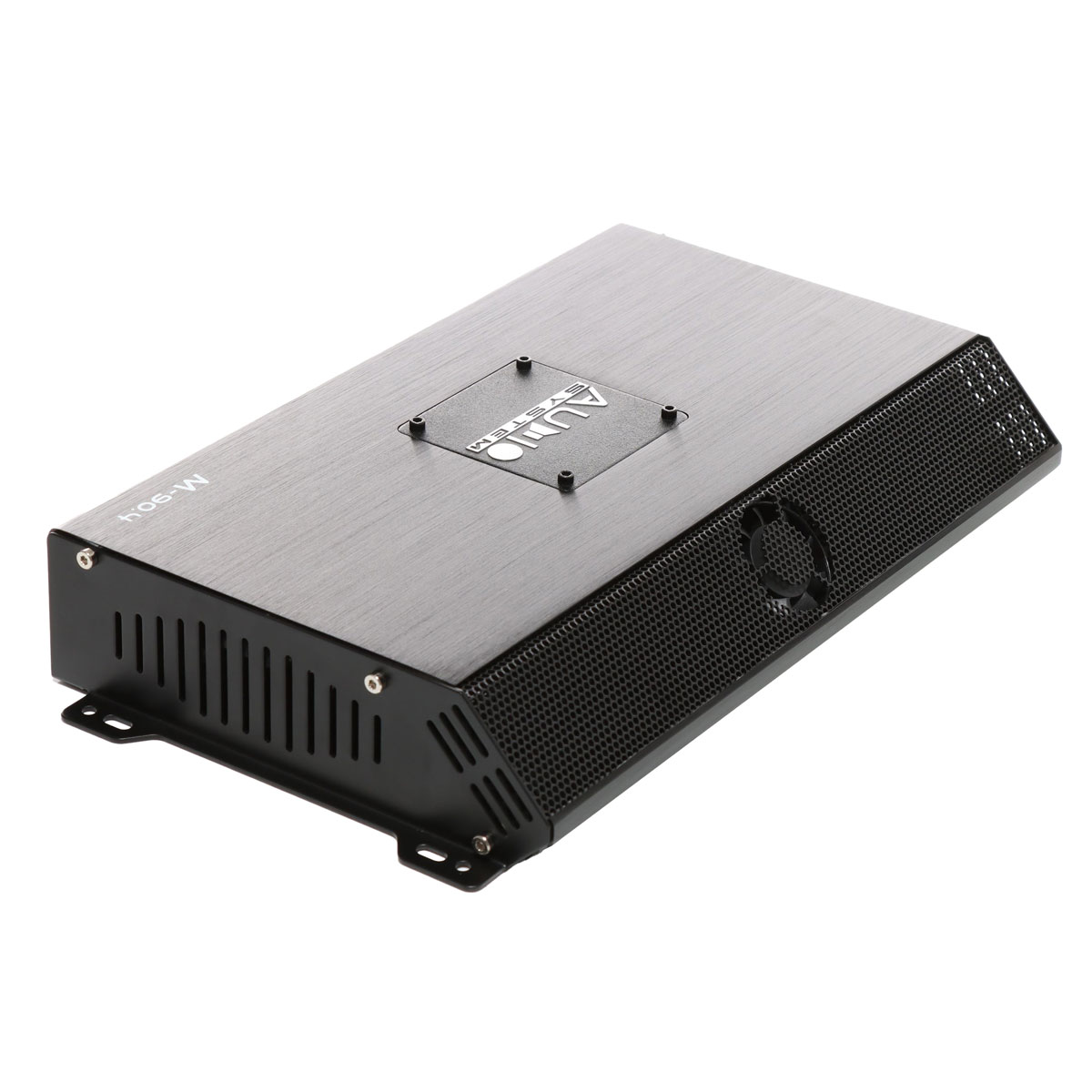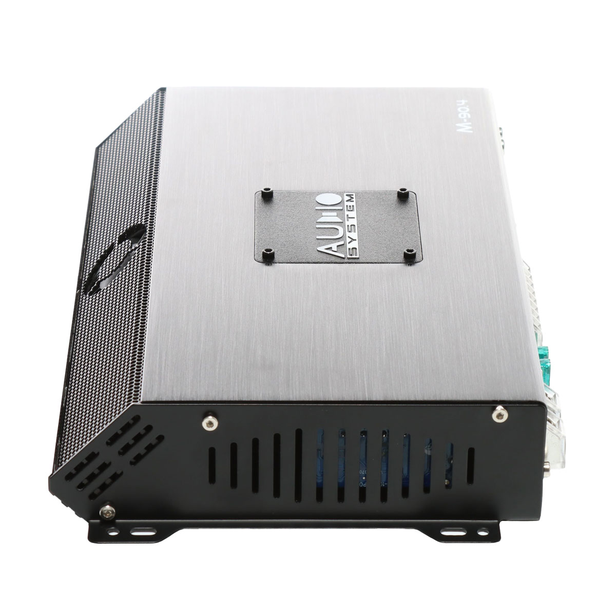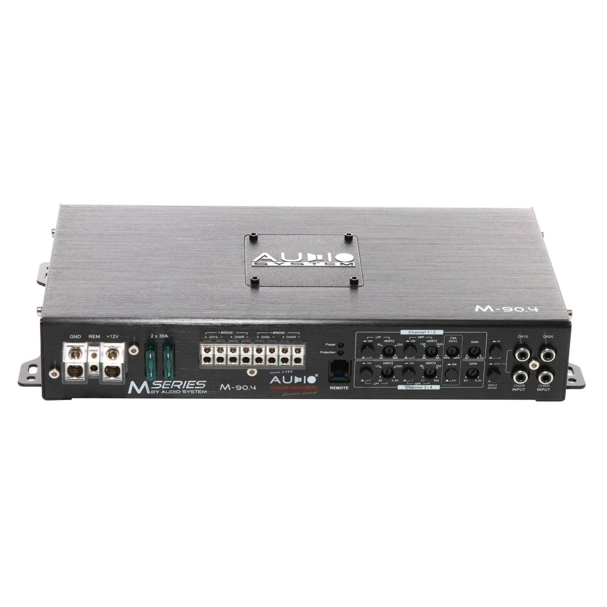 4-х канальный M-90.4 спроектирован для систем SQ. Компоновка органов коммутации и управления, находятся на одной стороне. Усилитель рассчитан на поканальное подключение фронтальных акустических систем. Например, твитеров и мидвуферов, благодаря развитой секции кроссоверных фильтров. В каждой паре каналов, помимо широких диапазонов ФНЧ/ФВЧ, можно организовать полосовой фильтр, для точной частотной настройки динамиков. Либо, работа на компонентный фронт + сабвуфер, мощностные характеристики располагают использовать подобную конфигурацию. Для такого случая, 3–4 сабвуферные каналы, рассчитаны на работу с проводным регулятором уровня сигнала RTC. При использовании усилителя в процессорной системе, есть возможность отключения фильтров.
