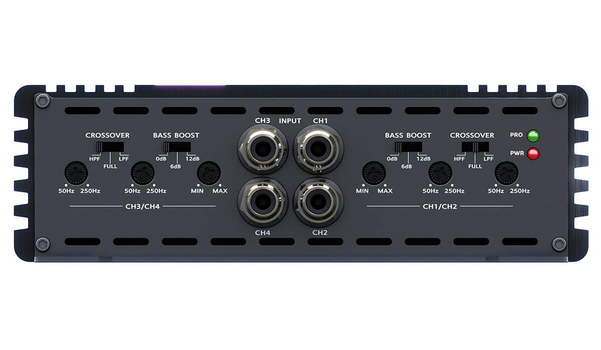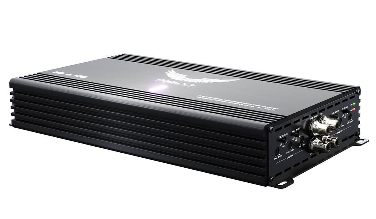 PROLOGY HQ-4.100 – 4/3/2-канальный усилитель мощности AB-класса. Мощность RMS (4/2 Ом): 4 x 100/170 Вт, мостовой режим (4 Ом): 2 х 350 Вт.